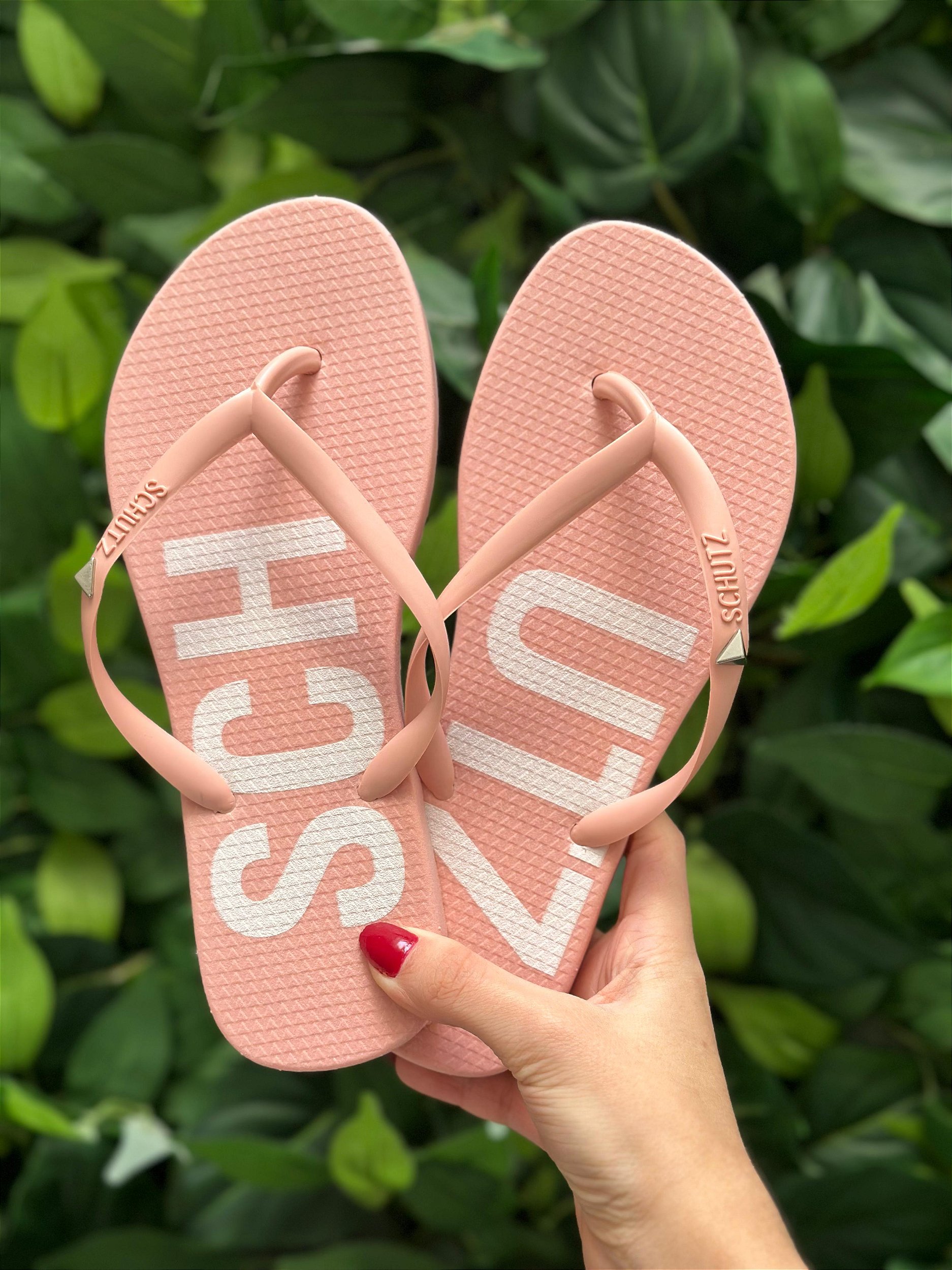 CHINELO COM TIRAS FINAS, APLICAÇÃO DO SCHUTZ LOGO E TOQUE GLAM DO TRIANGLE METALIZADO. SALTO EM 1.7 CM. REF S2063200020055U. COR ROSA CLARO.